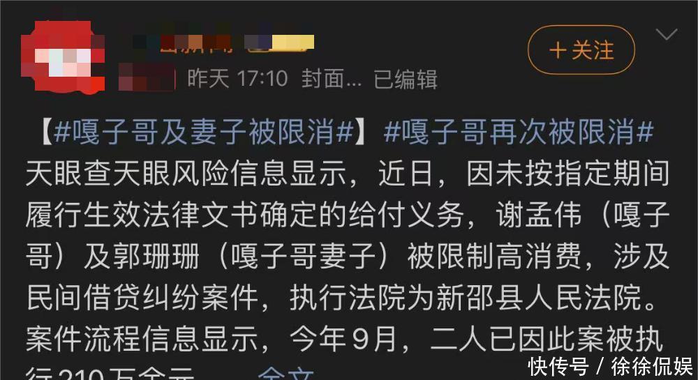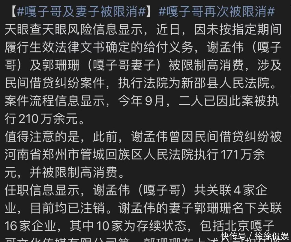11日,有消息爆出谢孟伟之前涉及民间借贷的相关案件。因为未能够履行法院判决的支付义务,被限制了高消费。就连他的妻子也没能够逃脱,一样的限制消费,而网友清一色的贬低,称他整个人“太狂了”。